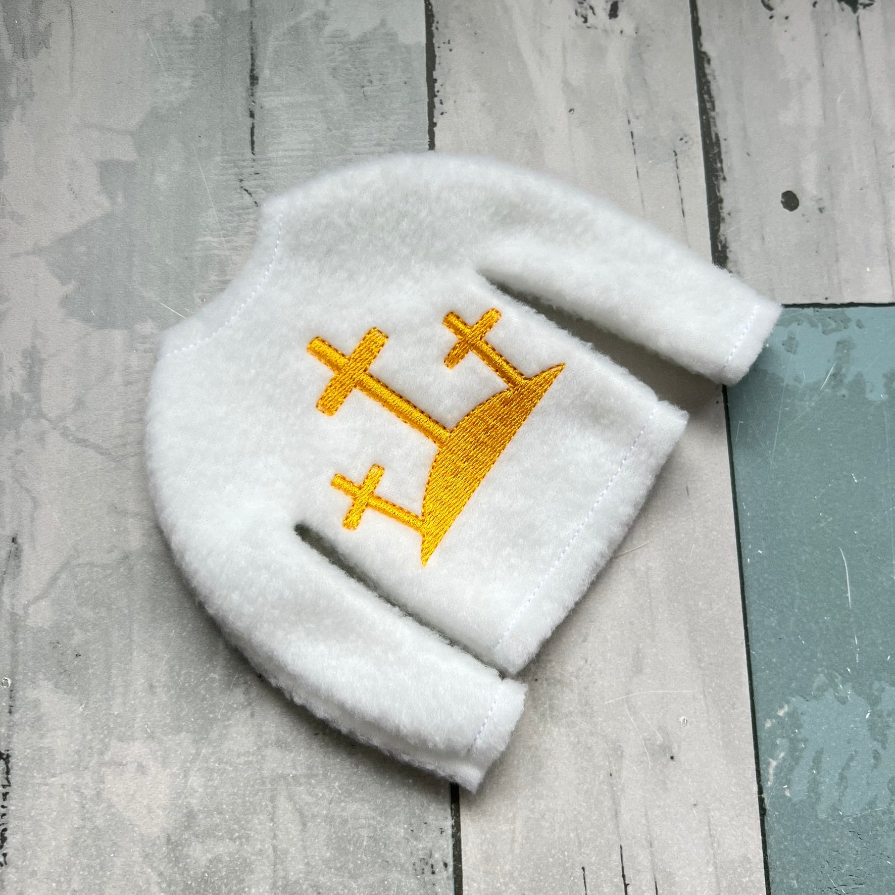 This peaceful white fleece sweater features an embroidered design of three crosses standing on a small mound, stitched in simple, gentle lines. The artwork feels calm and meaningful, giving your elf a quiet, reflective look that fits beautifully into faith‑centered holiday scenes.