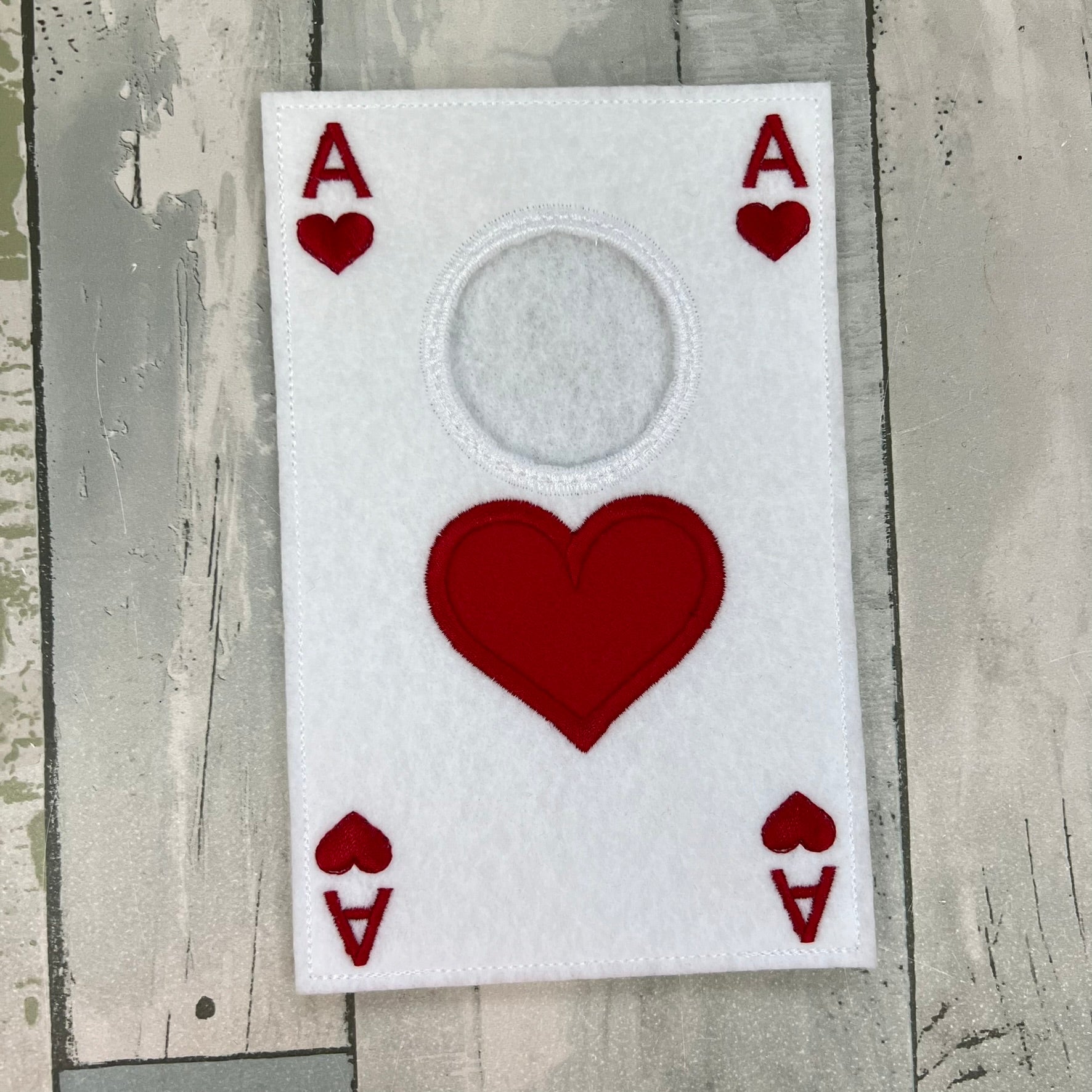 A soft felt Ace of Hearts costume sized for a small holiday elf friend. Clean white shapes and a bright red heart make it perfect for card themed scenes and cheerful seasonal play.