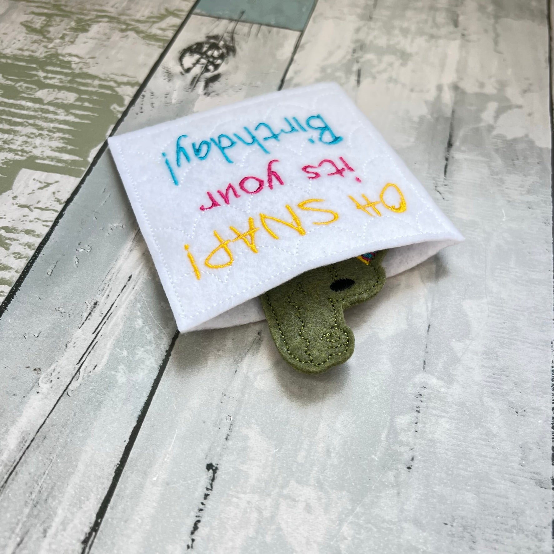 A handmade felt alligator finger puppet with a party hat, paired with an “Oh snap! It’s your birthday!” card for fun and festive gifting.