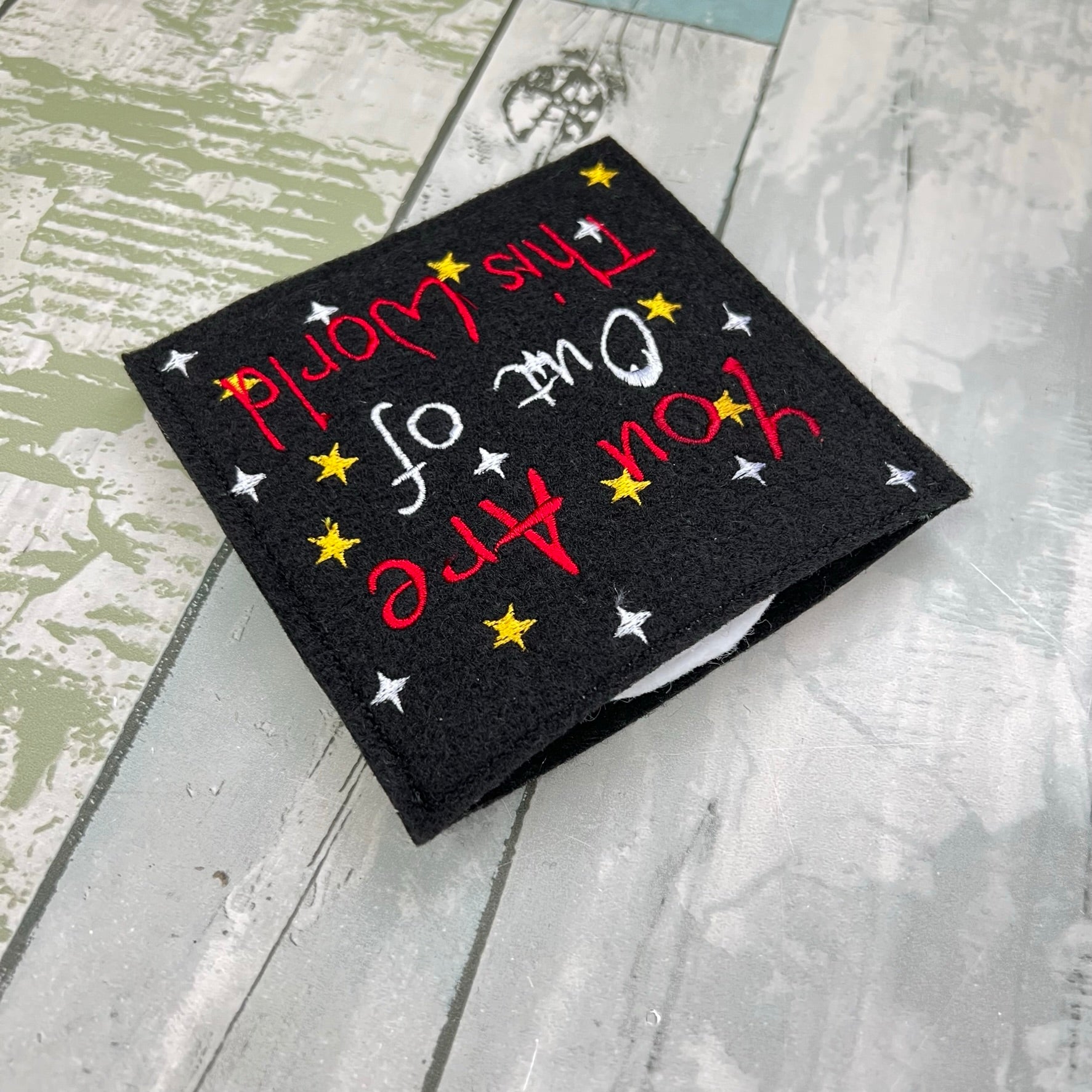 A handmade felt astronaut finger puppet paired with a “You are out of this world” card for cosmic and encouraging gifting.