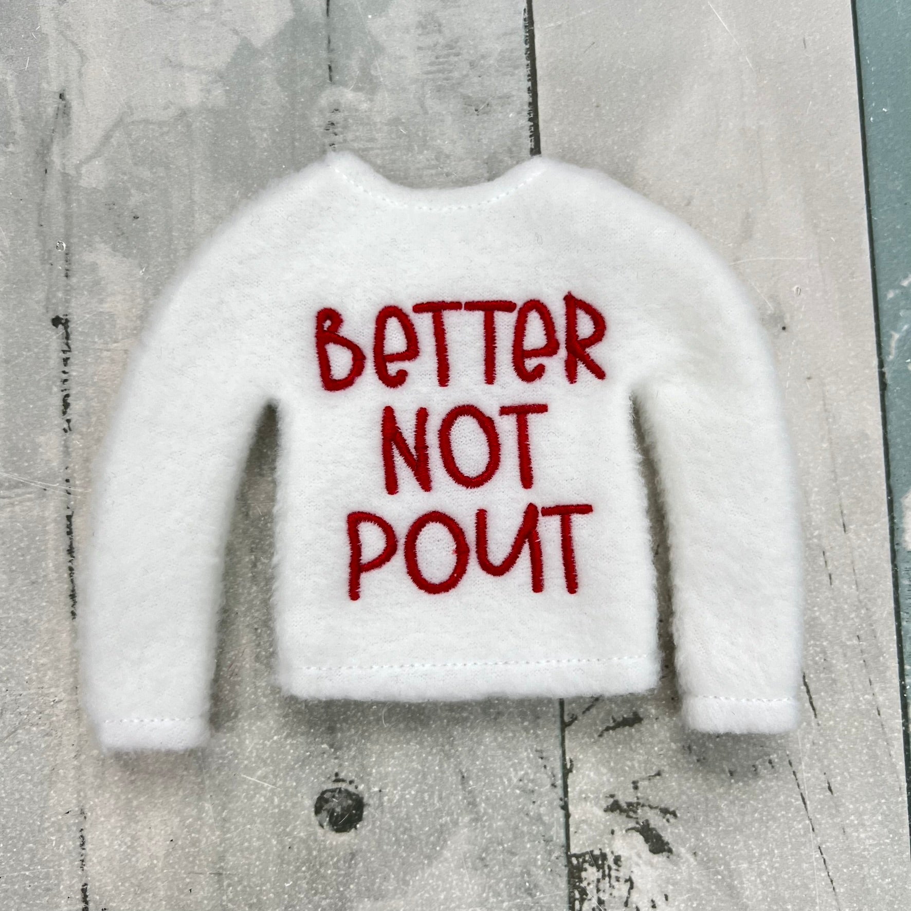 A fleece sweater in red or white embroidered with “Better Not Pout.” Perfect for festive scenes, playful reminders and cheerful elf fun.