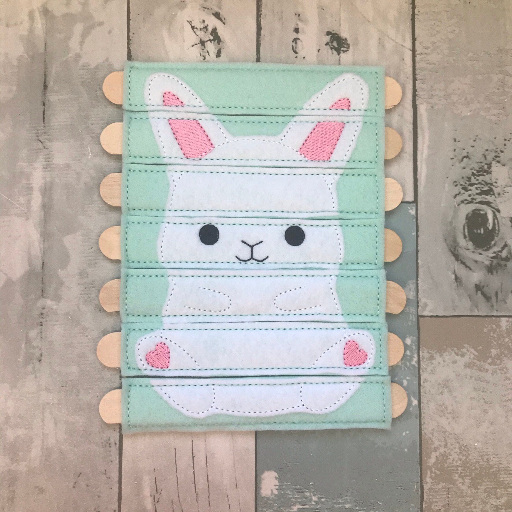 A handmade felt strip puzzle featuring a sweet bunny rabbit. Lightweight, soft and perfect for quiet play and little animal lovers.