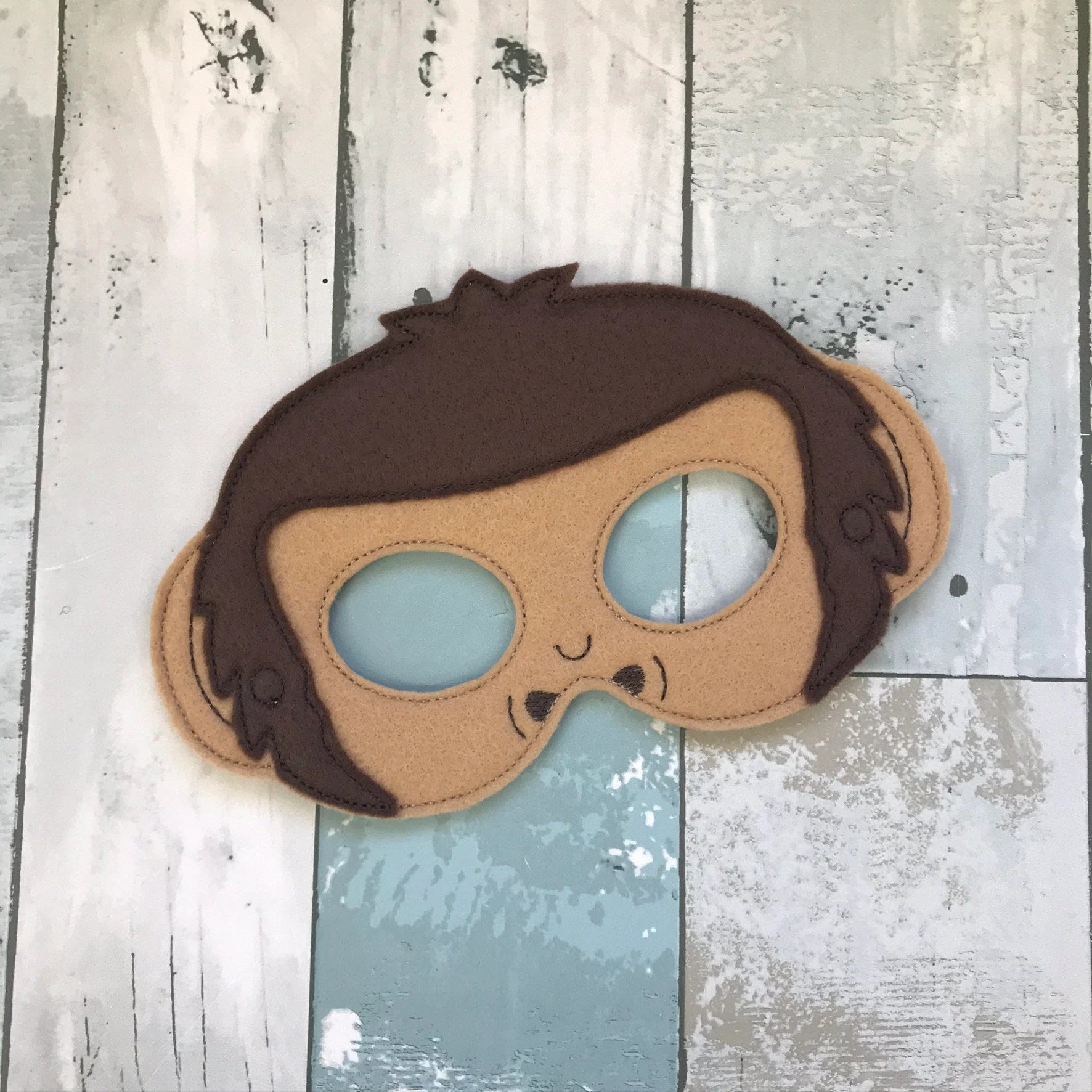 This handmade felt mask features a cheerful chimpanzee face with soft brown felt, rounded ears and a friendly expression that invites instant giggles. Kids love how it transforms them into a playful little primate, ready for jungle adventures, silly dances and all kinds of imaginative fun.