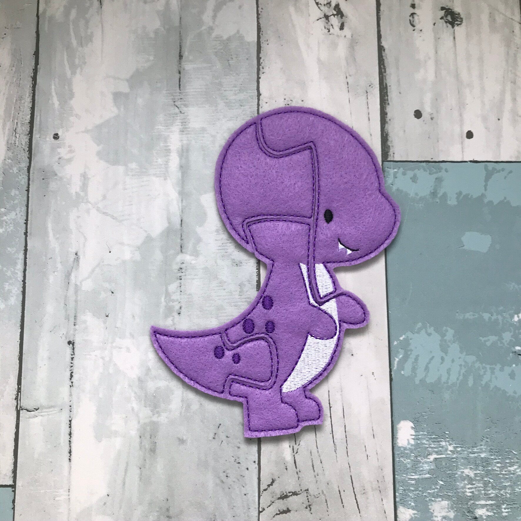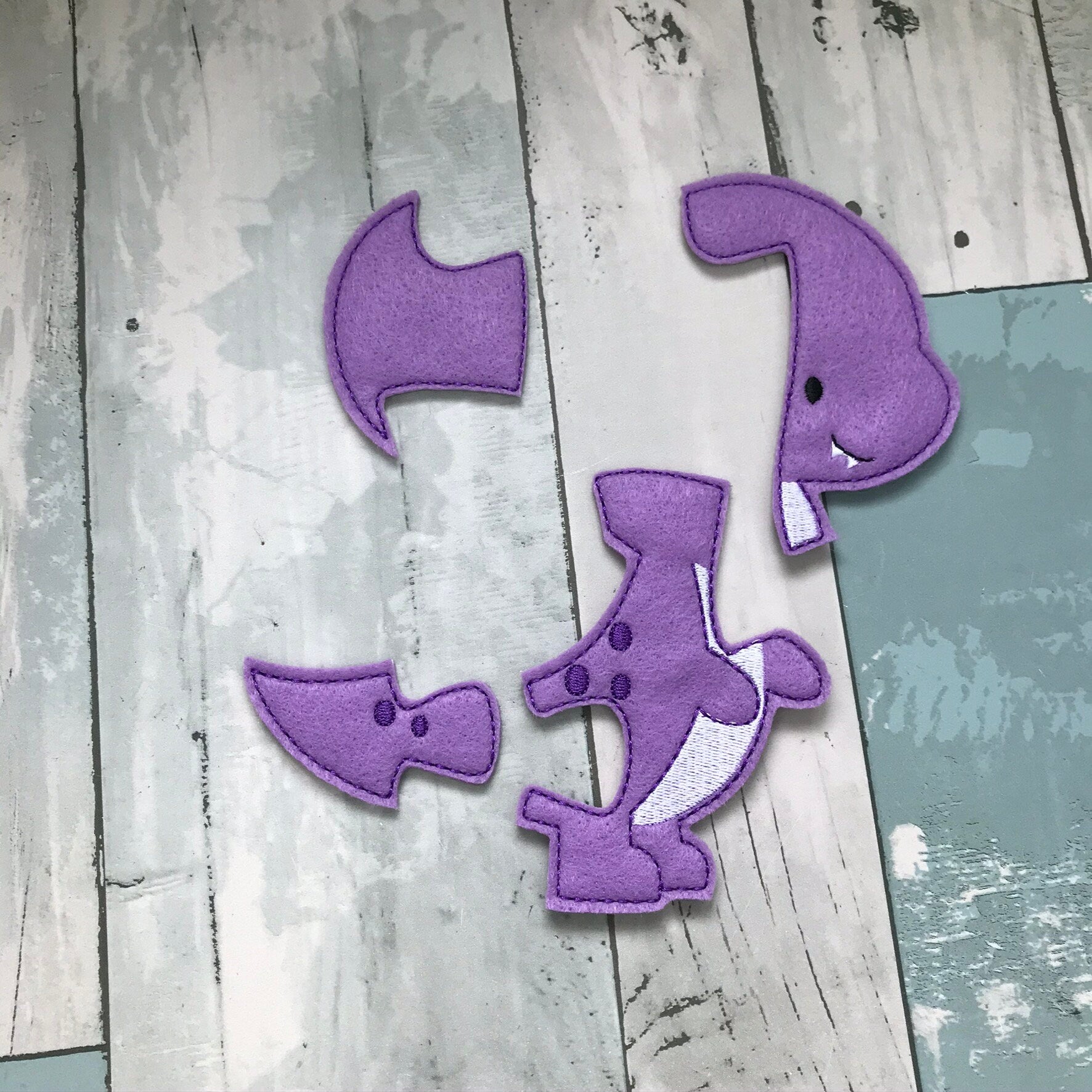 A handmade felt puzzle featuring a cheerful purple dinosaur. Lightweight, soft and perfect for quiet play and kids who love playful prehistoric characters.