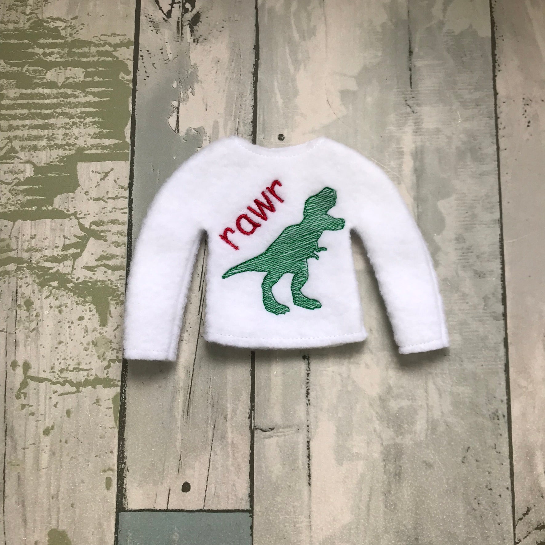 A white fleece sweater embroidered with a cute dinosaur and the word “rawr.” Perfect for dino scenes, playful setups and cheerful elf moments.
