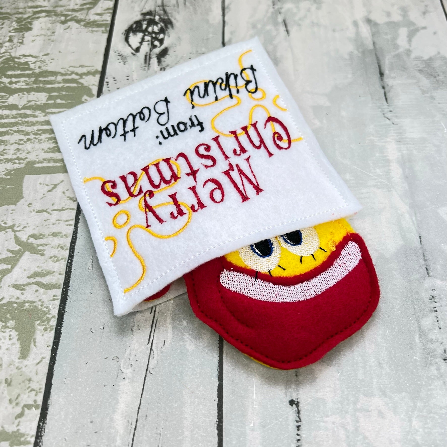 A handmade felt sea sponge finger puppet in a Santa hat, paired with a “Merry Christmas from Bikini Bottom” card for festive and playful gifting.