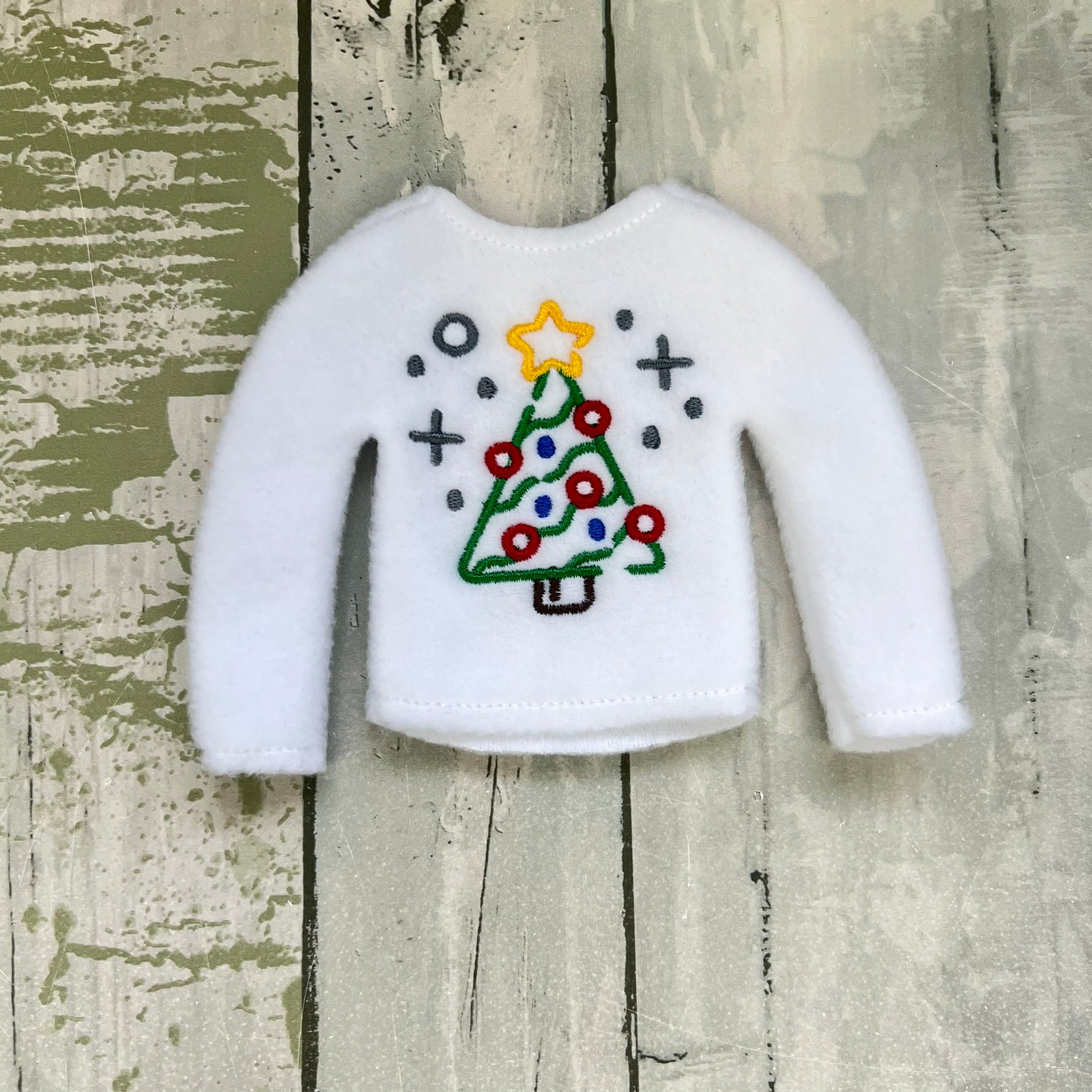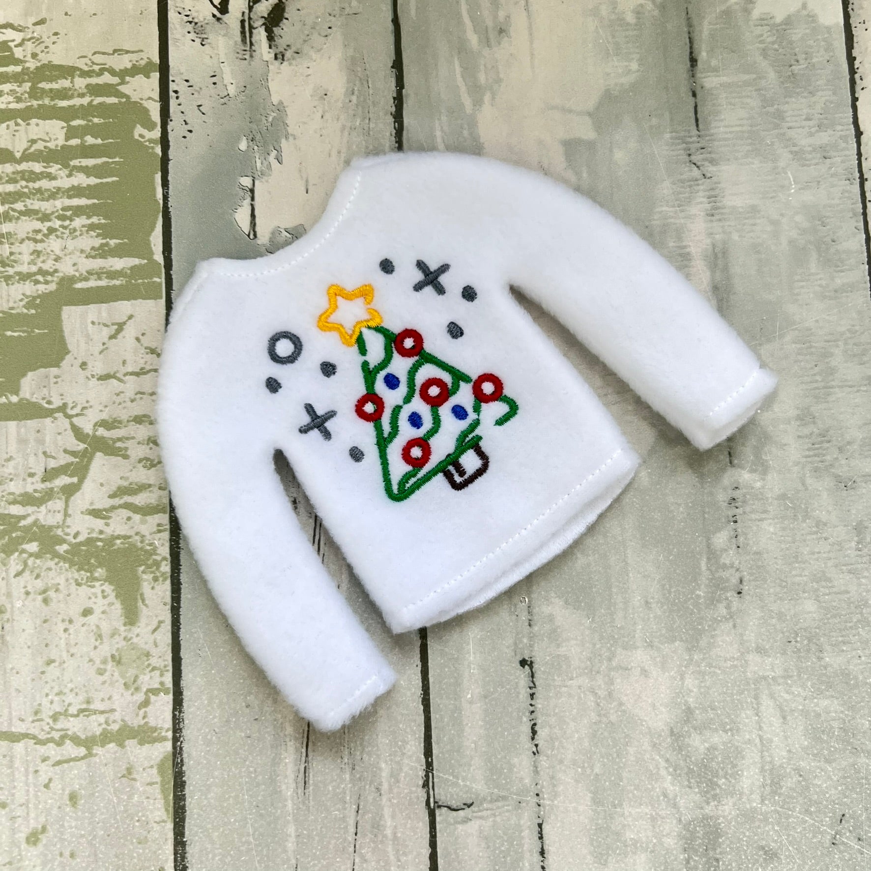A white fleece sweater embroidered with a doodled Christmas tree topped with a yellow star. Perfect for festive scenes and playful elf fun.