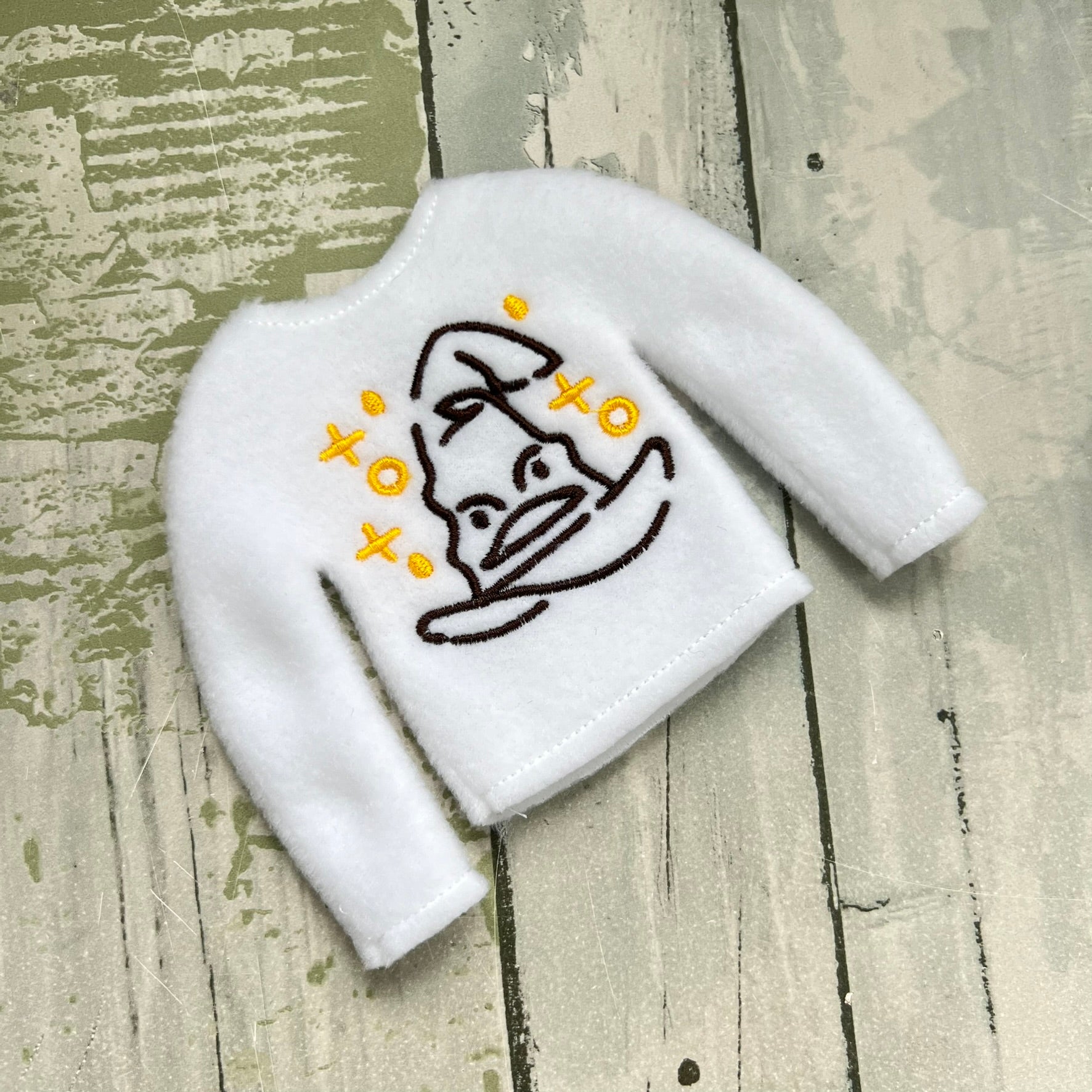 A soft white fleece sweater embroidered with a whimsical sorting hat doodle. Perfect for magical scenes, cozy castle play and imaginative elf moments.