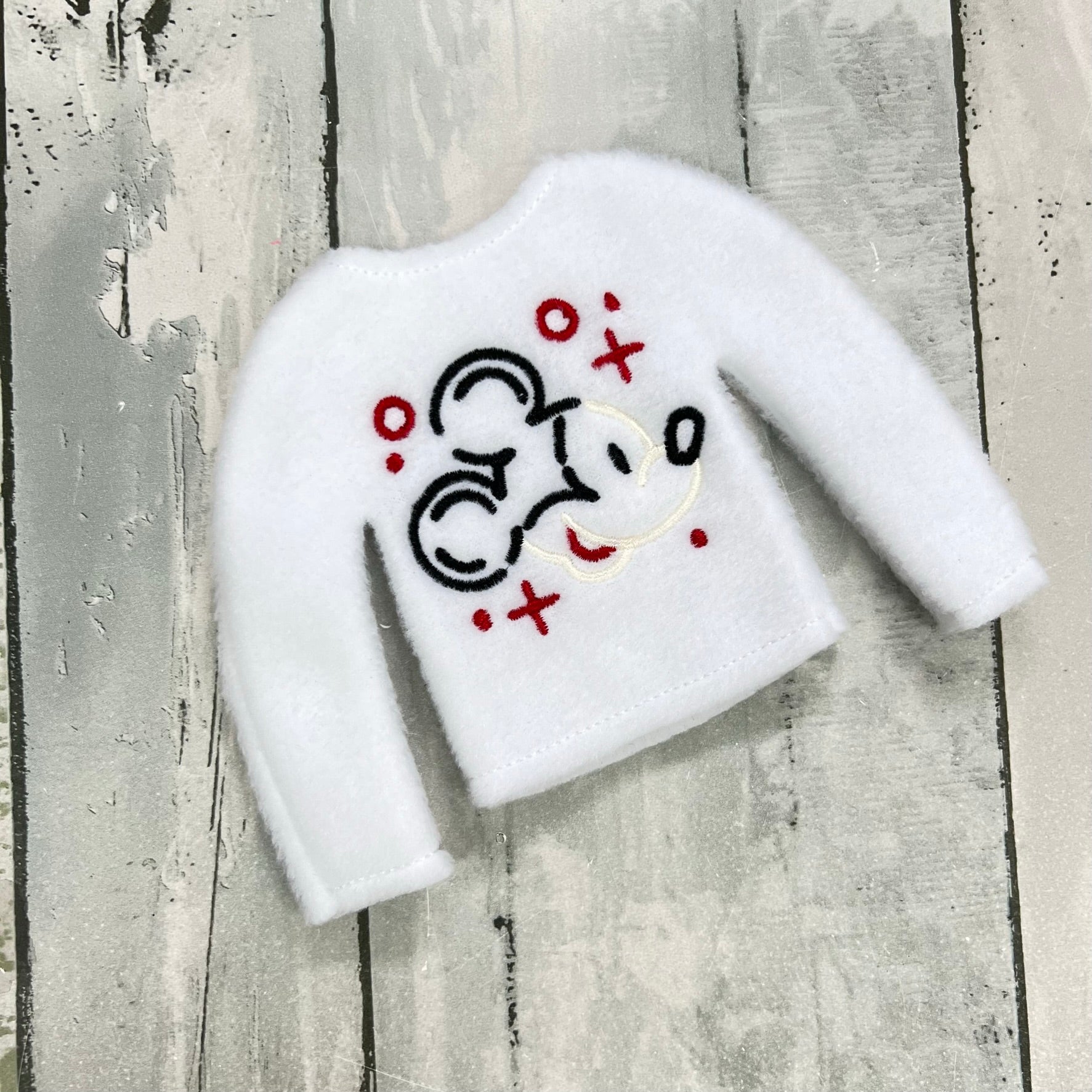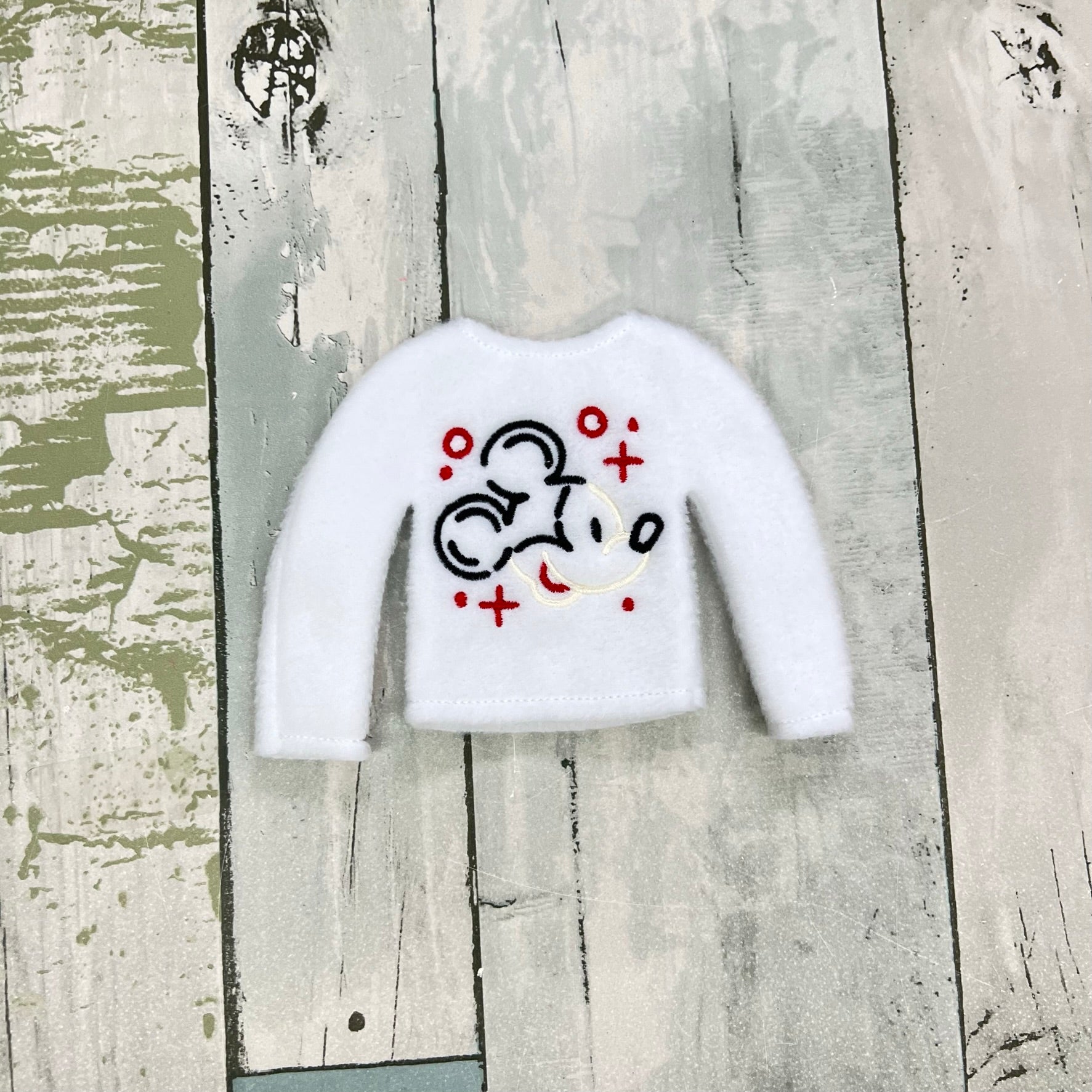This adorable white fleece sweater features a simple embroidered doodle of a round‑eared friend with cheerful curves and classic charm. The sketchy line art feels like a quick, happy scribble straight from a theme park daydream, giving your elf a playful, nostalgic look.