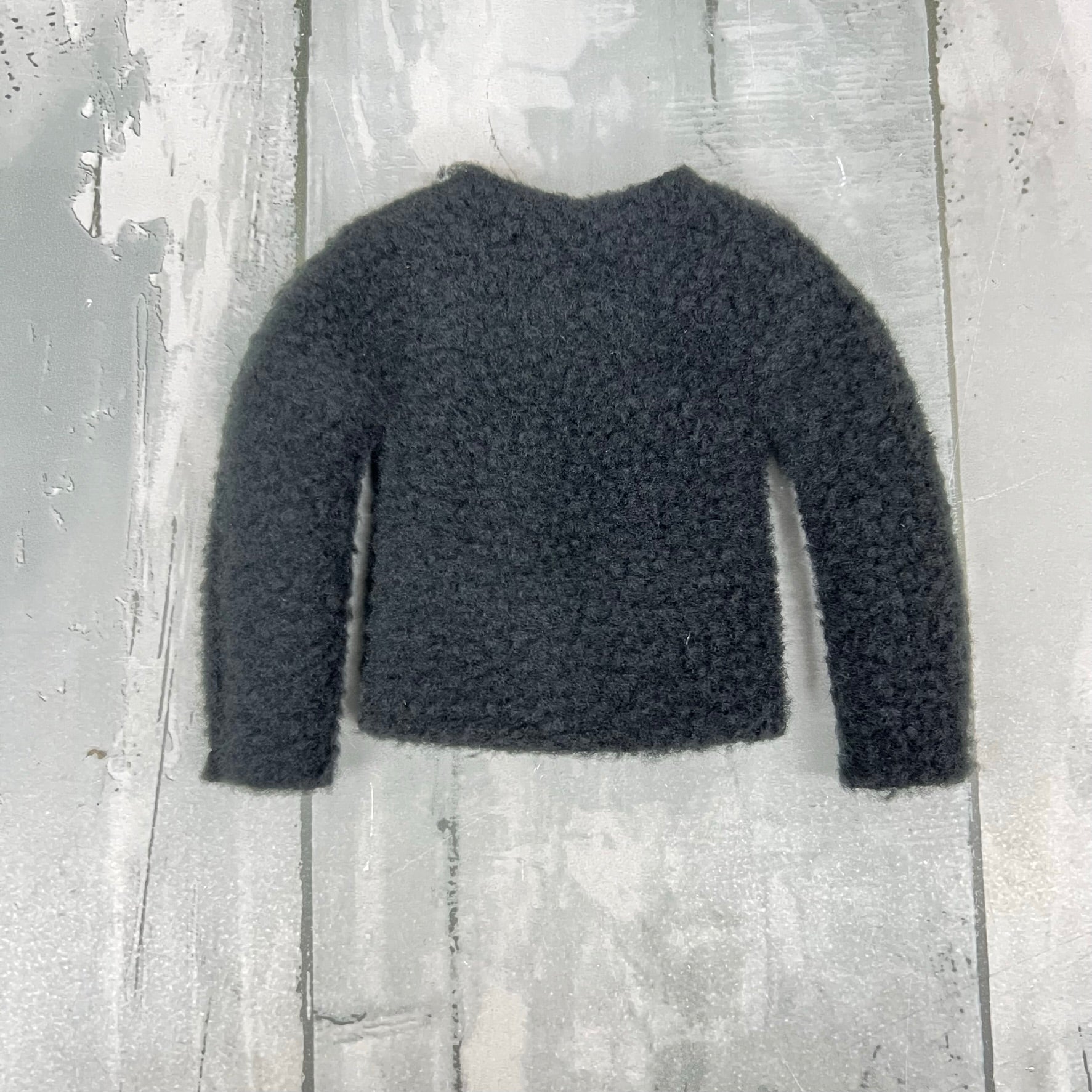 A black fleece sweater embroidered with a whimsical Boba Fett style doodle. Perfect for space themed scenes and adventurous elf play.