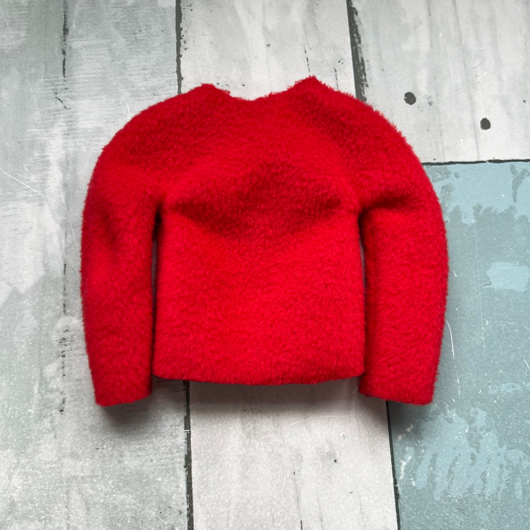 This bright red fleece sweater gives your elf a fun, vintage inspired look with its embroidered script logo that feels instantly familiar. The bold white stitching pops against the red background, creating a cheerful, retro style that fits perfectly into kitchen scenes, snack setups or playful holiday displays.