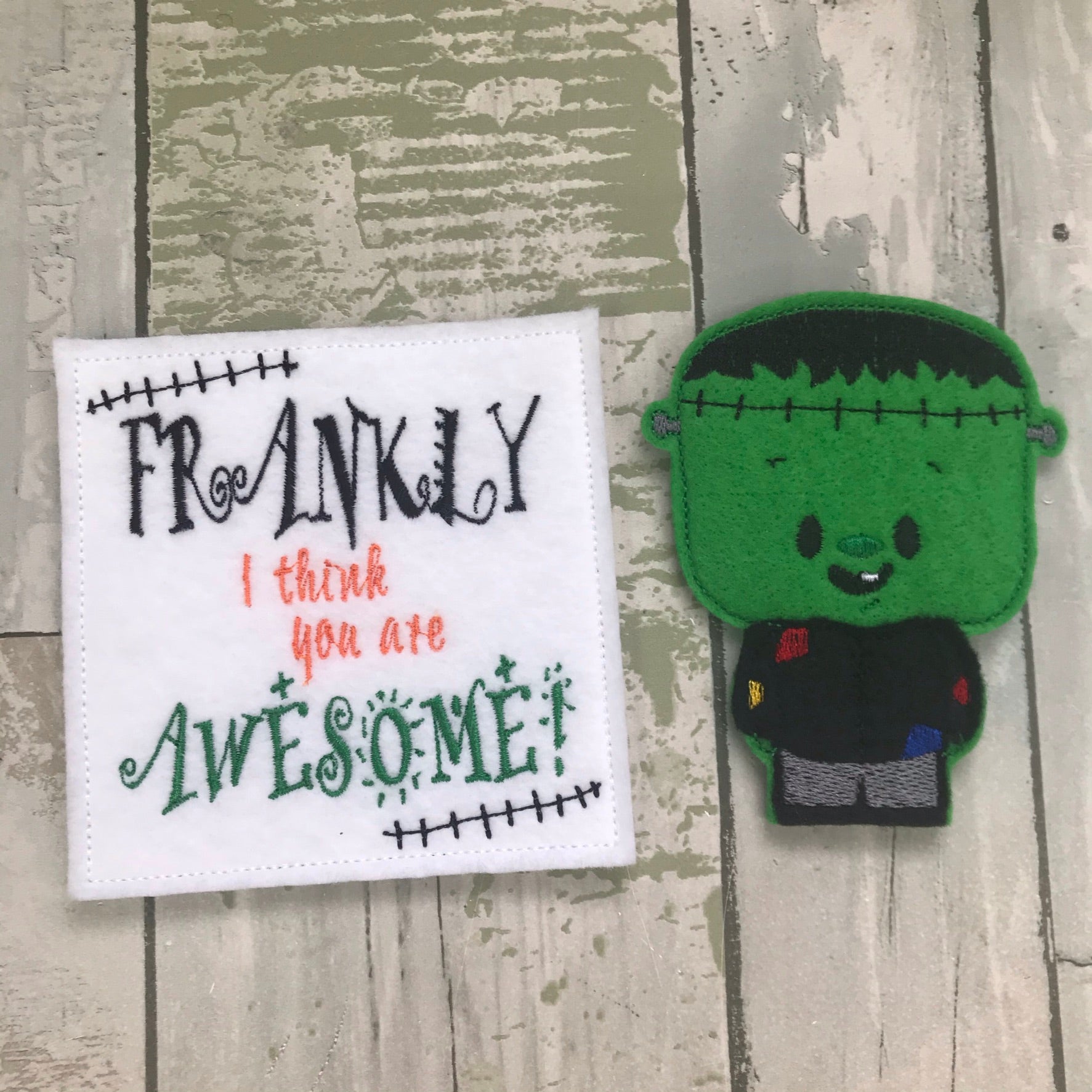 A handmade felt Frankenstein‑style finger puppet paired with a “Frankly, I think you are awesome!” card for cute and quirky gifting.