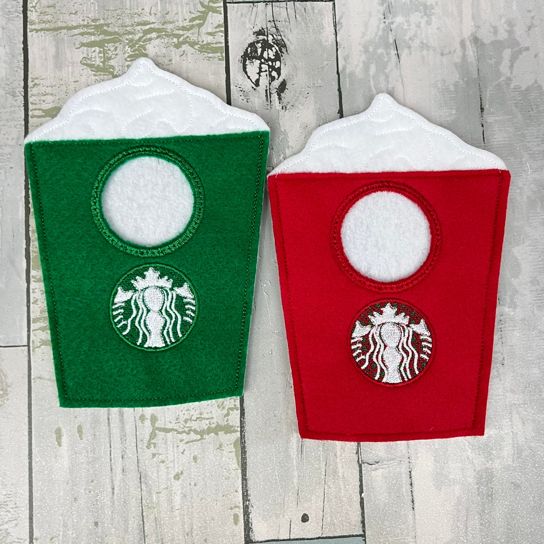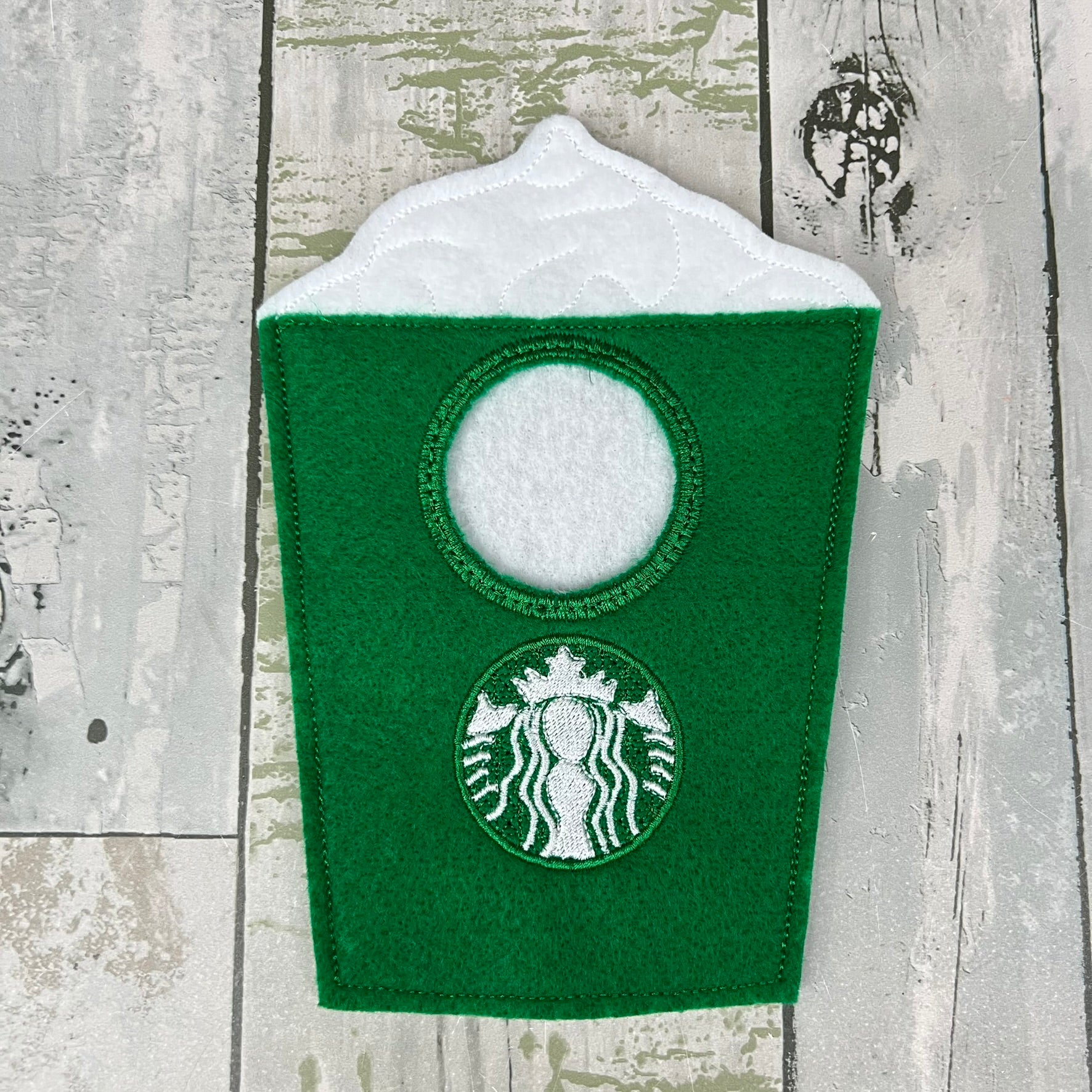 A festive cup costume with soft whipped topping details, sized for a small holiday elf friend. Available in green or red, perfect for cozy kitchen scenes and warm holiday play.
