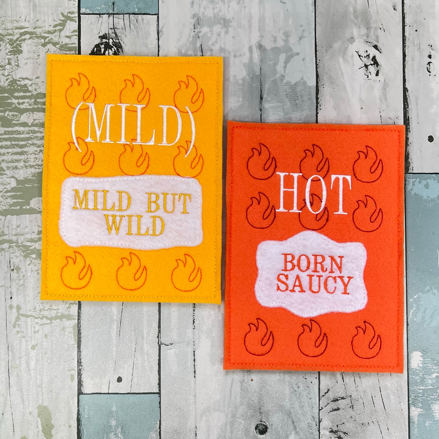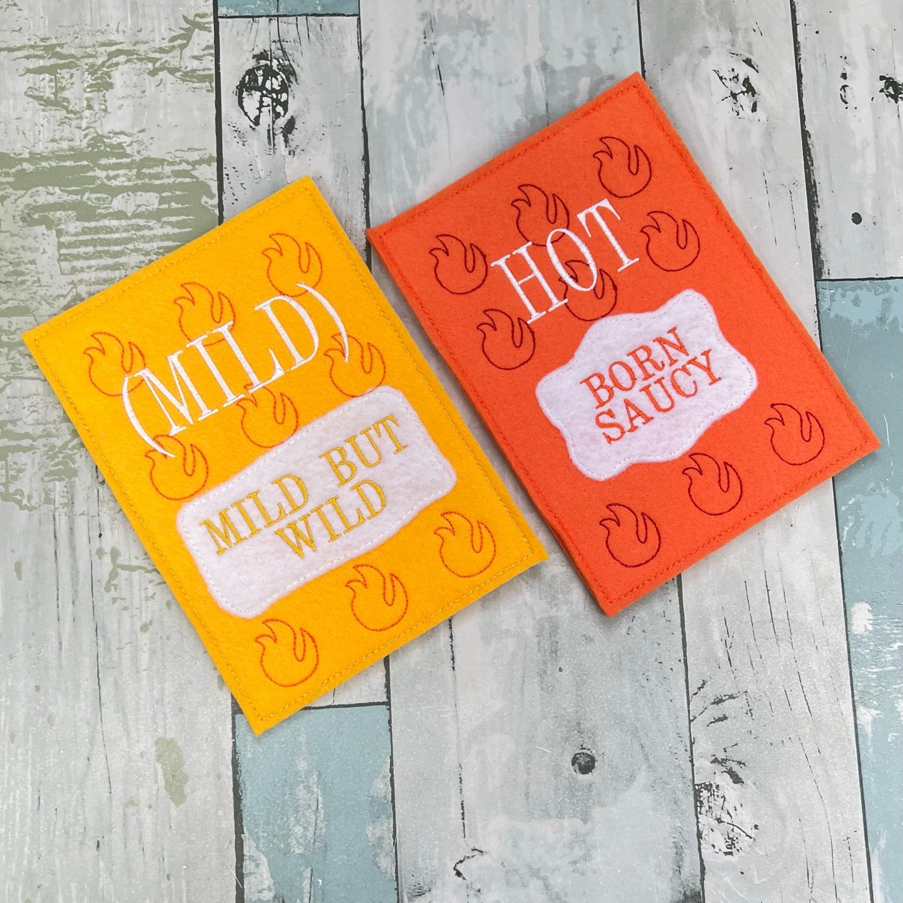 A bright hot sauce packet costume sized for a small holiday elf friend, available in mild or hot. Colorful felt and bold details make it perfect for playful kitchen scenes and fun seasonal surprises.