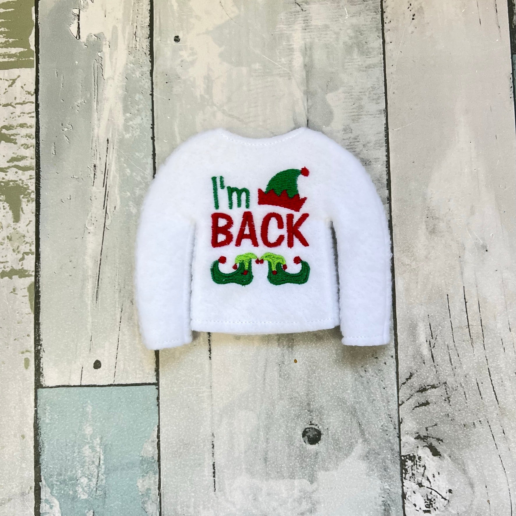 A soft white fleece sweater embroidered with “I’m BACK” plus a tiny elf hat and shoes. Perfect for your elf’s first appearance of the season