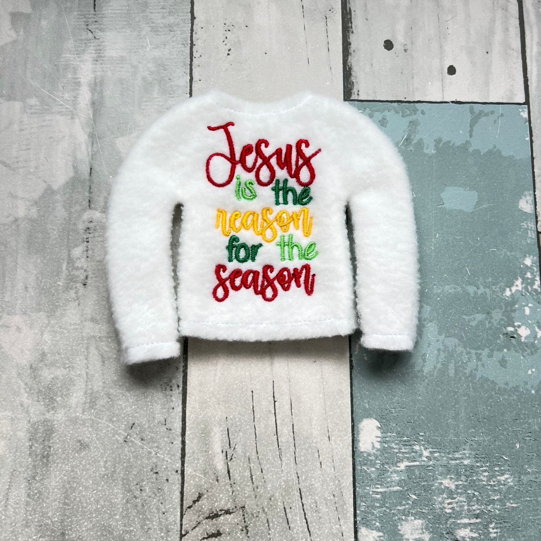 A soft white fleece sweater embroidered with “Jesus is the reason for the season” in bright multicolored lettering. A warm and meaningful addition to your elf’s holiday wardrobe.