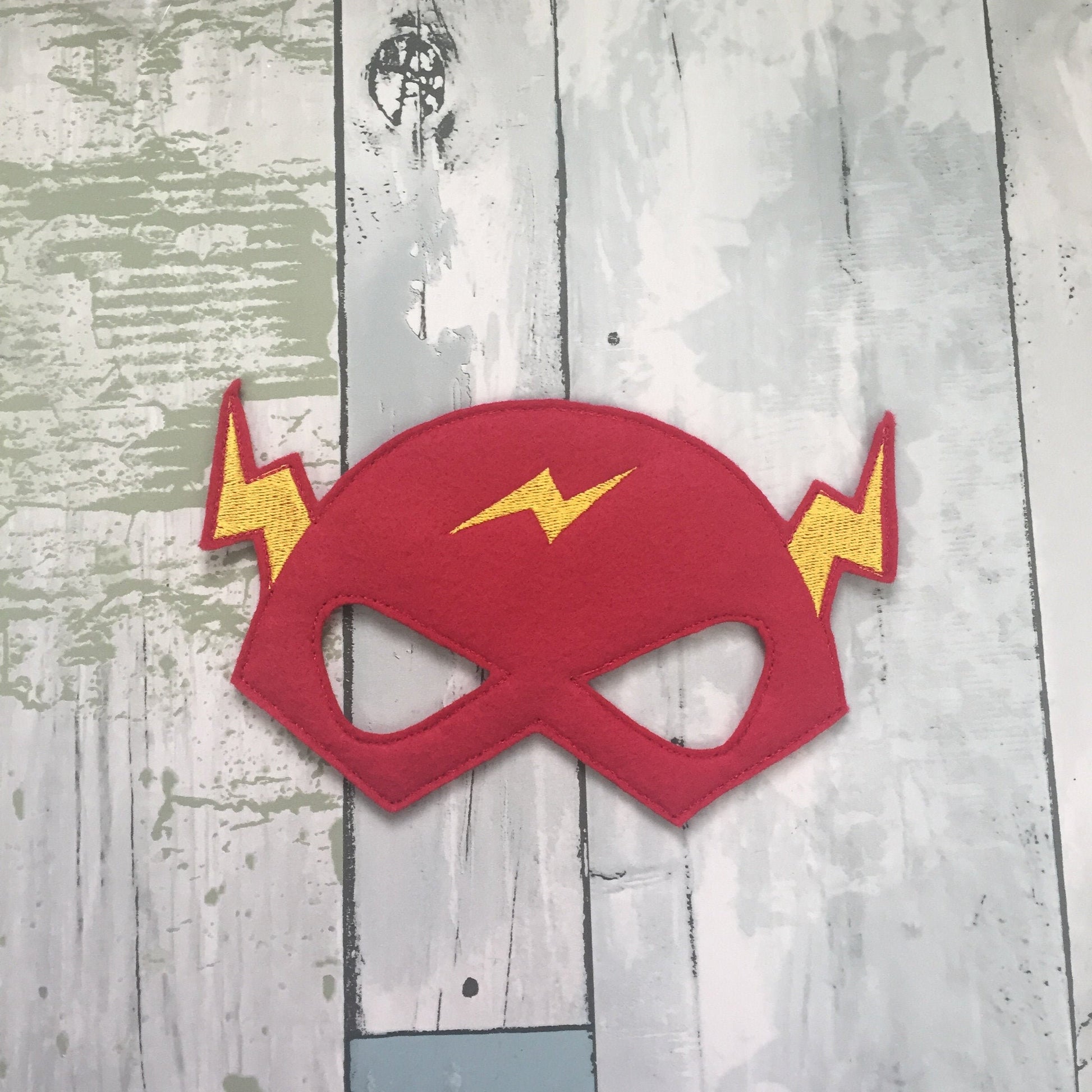 A dynamic handmade felt mask inspired by a speedy red‑and‑yellow hero. Soft felt, comfy elastic and bold lightning‑themed details make it perfect for kids who love fast action and imaginative superhero play.