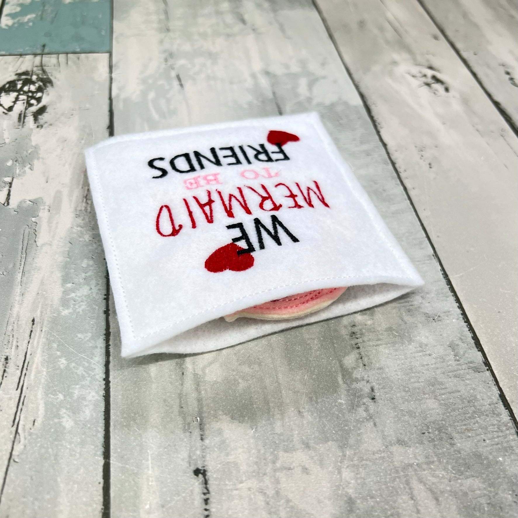A handmade felt mermaid finger puppet with flowing pink hair, paired with a “We mermaid to be friends” card for sweet, ocean themed fun.