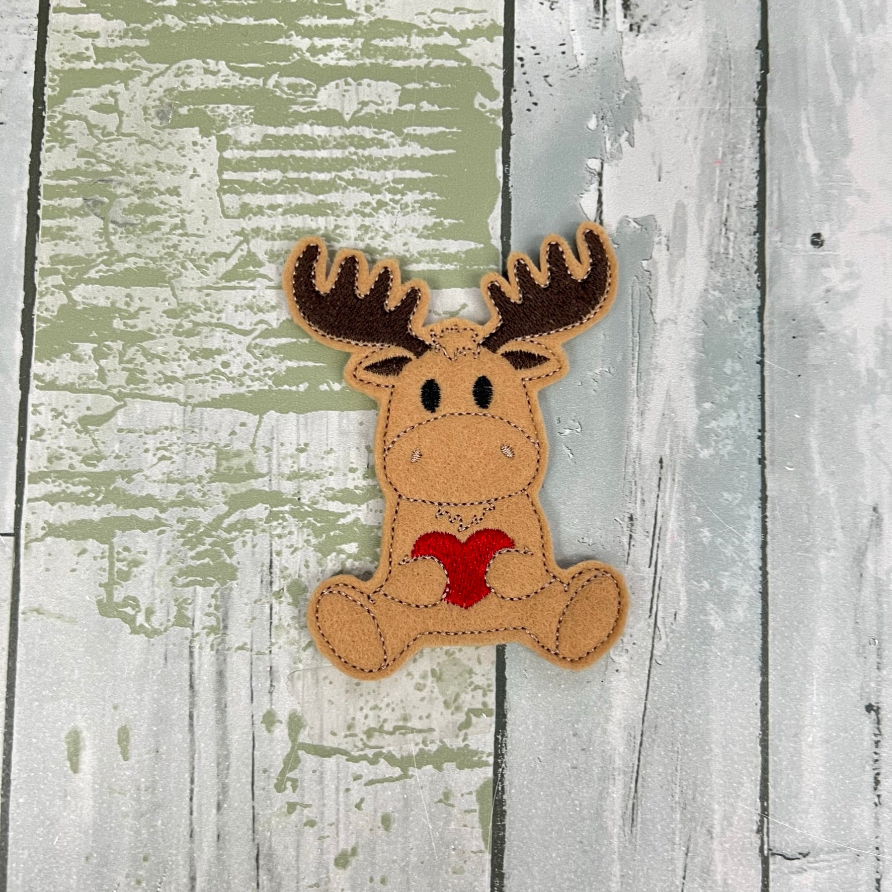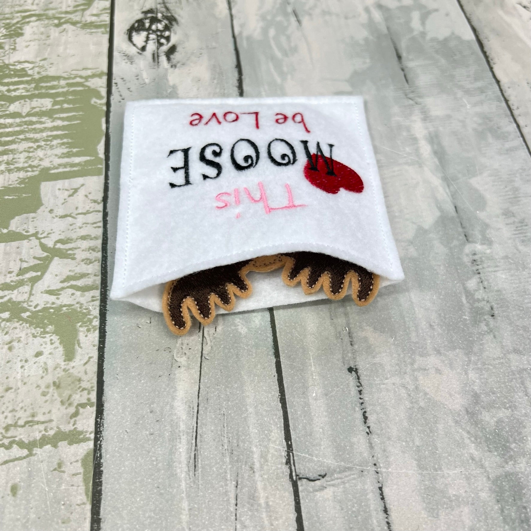 A handmade felt moose finger puppet holding a heart, paired with a “This moose be love” card for sweet and playful gifting.