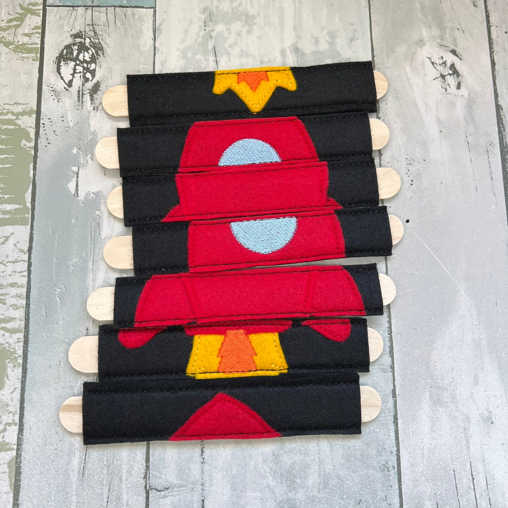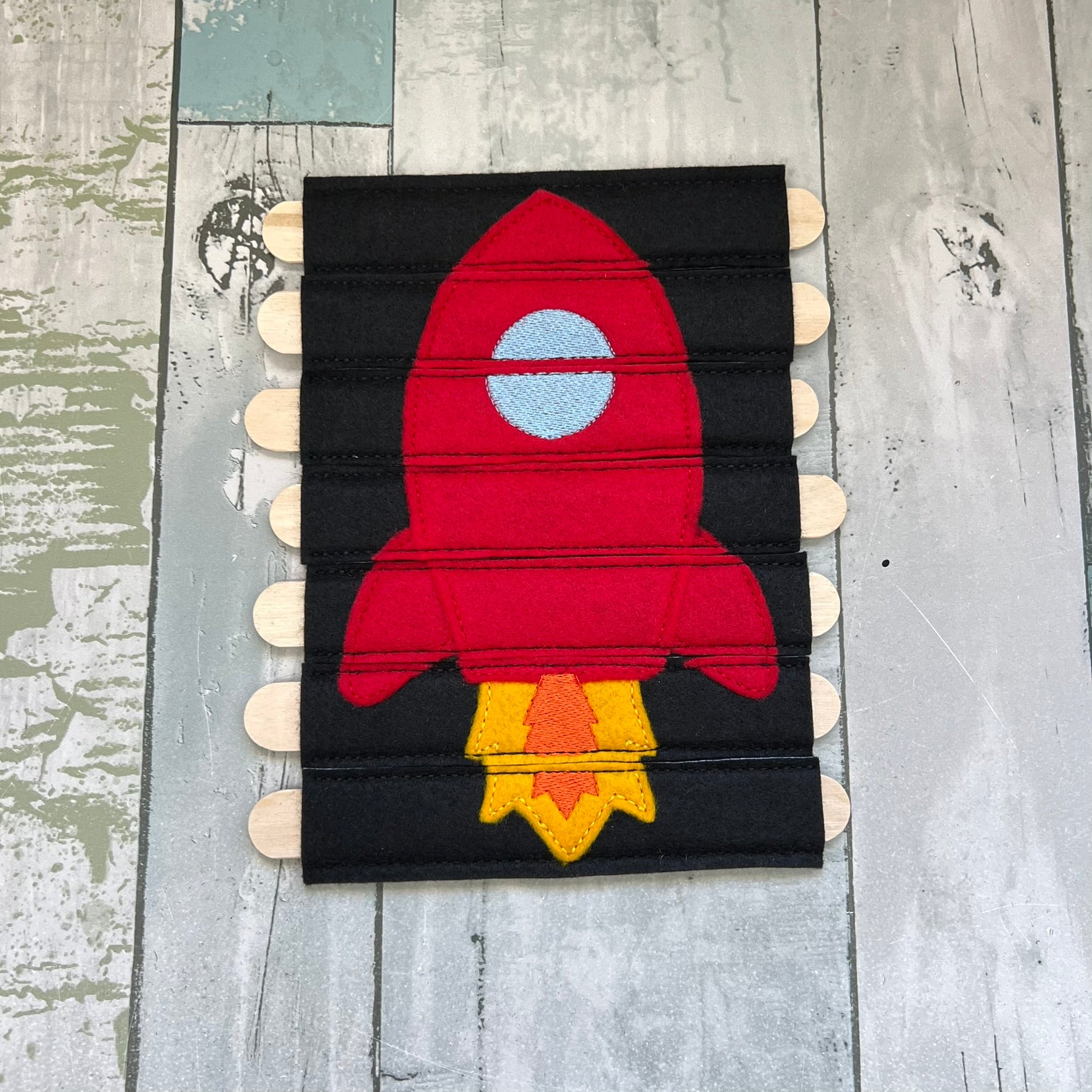 A handmade felt strip puzzle featuring a bright red rocket with a glowing flame. Soft, lightweight and perfect for quiet play and little space explorers.