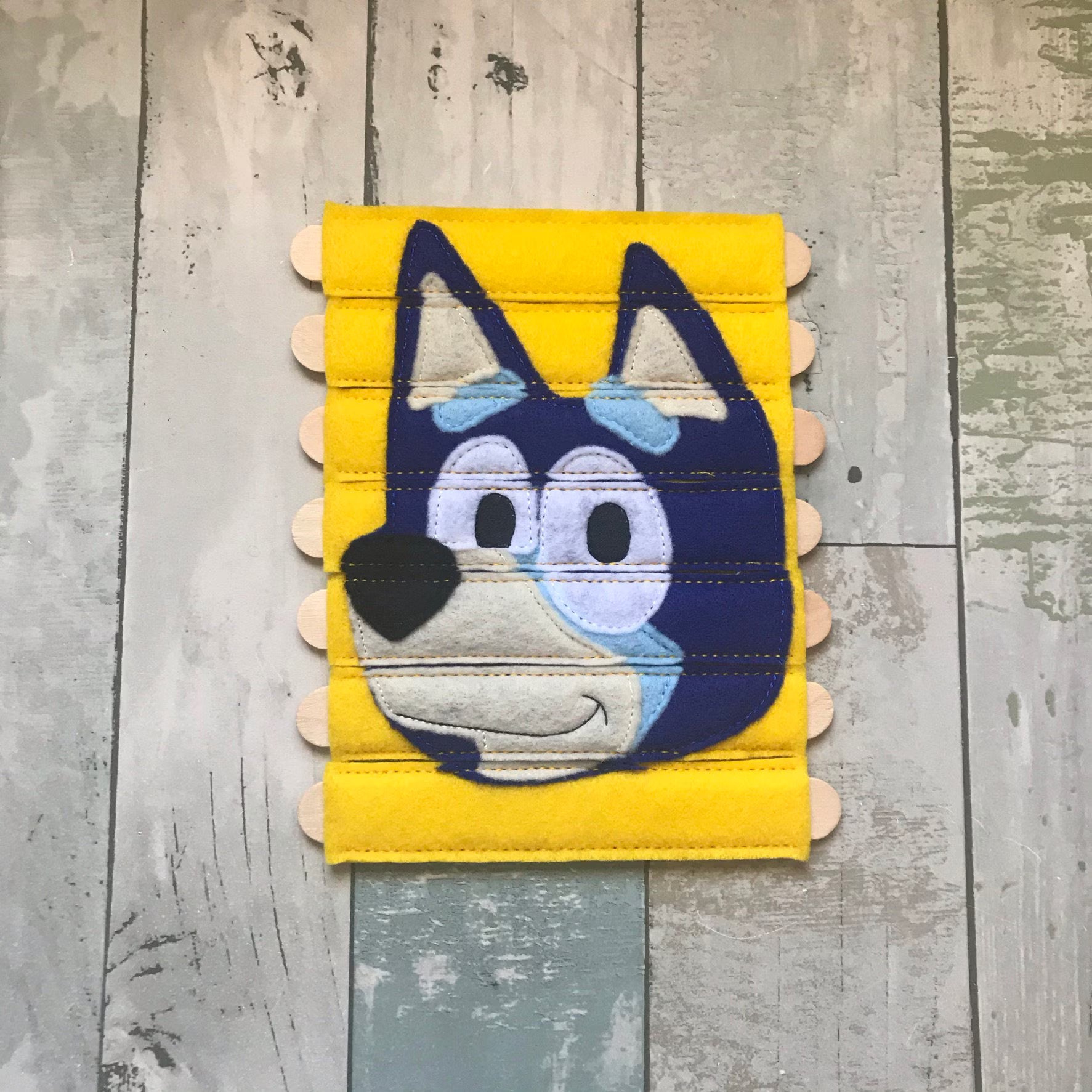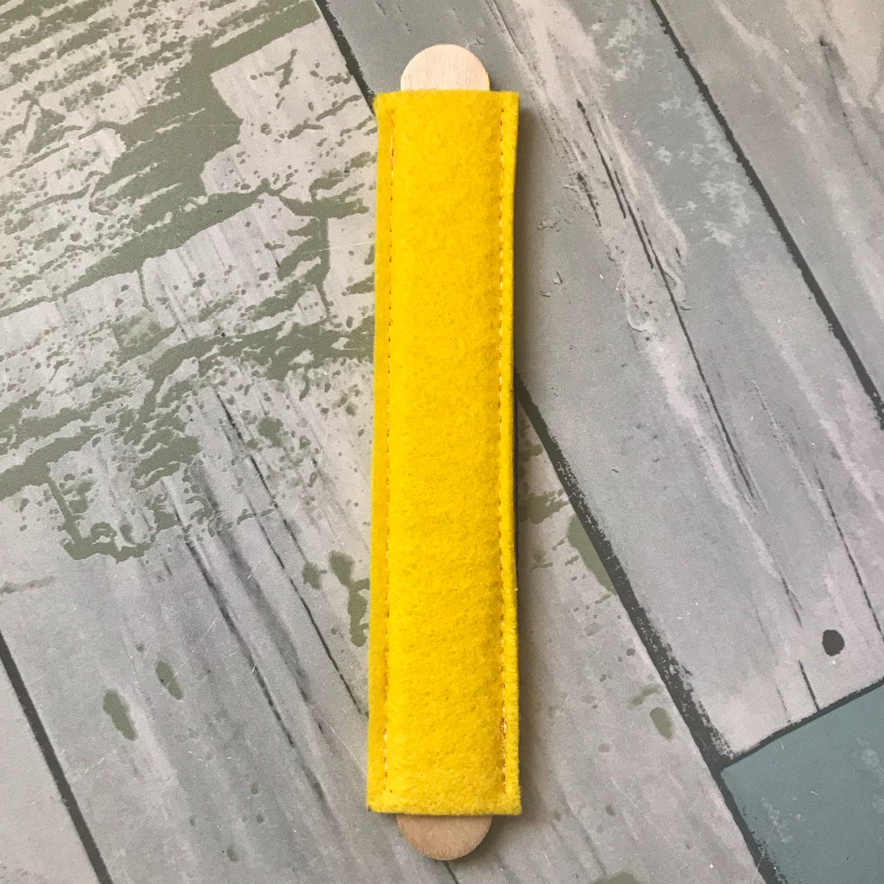 A handmade felt strip puzzle featuring a thoughtful little blue pup on a sunny yellow background. Soft, calming and perfect for quiet play and emotional storytelling.