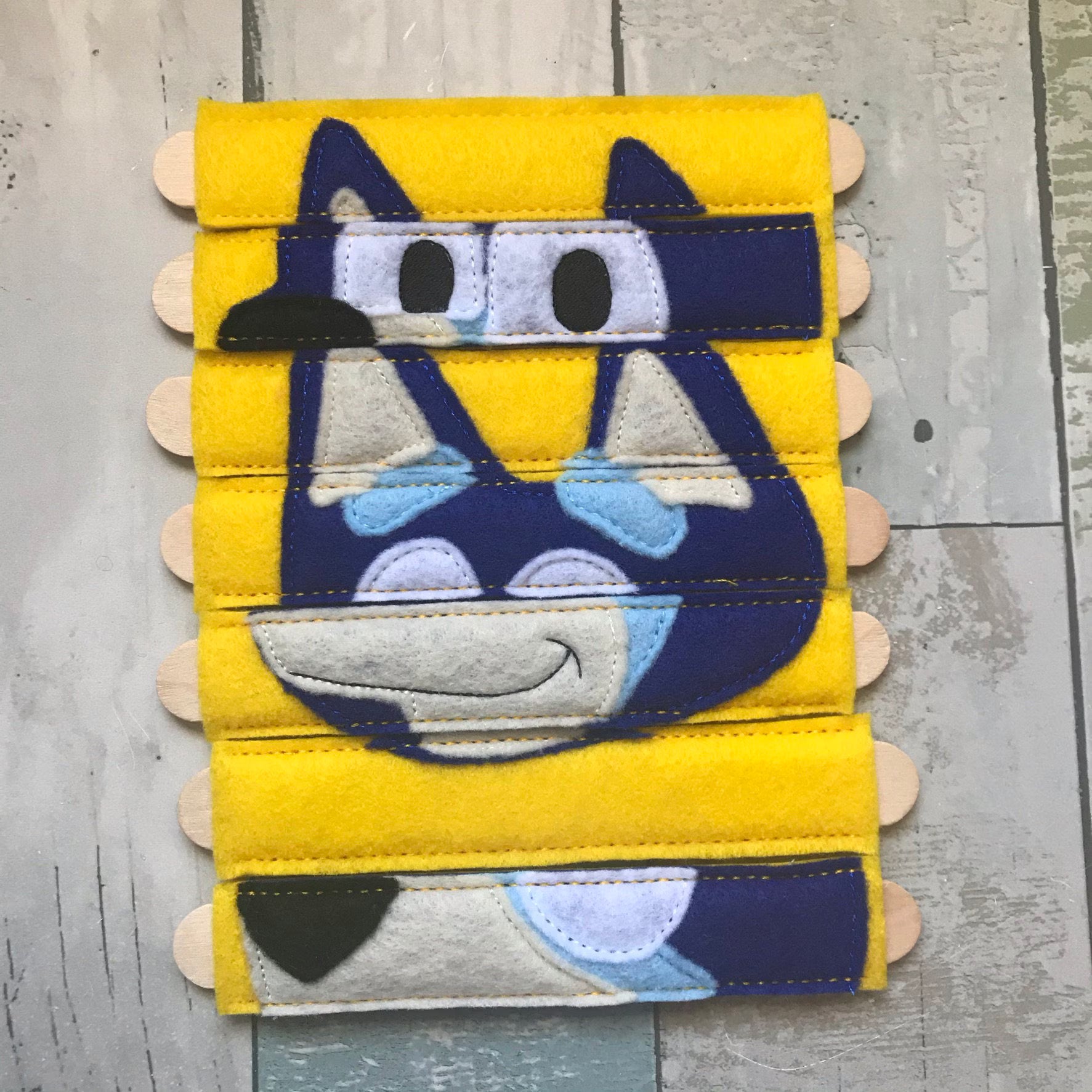 This handmade felt puzzle captures a tender moment with a little blue pup sitting against a warm yellow background. Her thoughtful expression and soft stitched details make the puzzle feel gentle and heartfelt — the kind of quiet emotion kids instantly recognize. As they line up the strips and rebuild her picture, they get a chance to explore feelings, focus their minds and enjoy a calm, comforting activity.