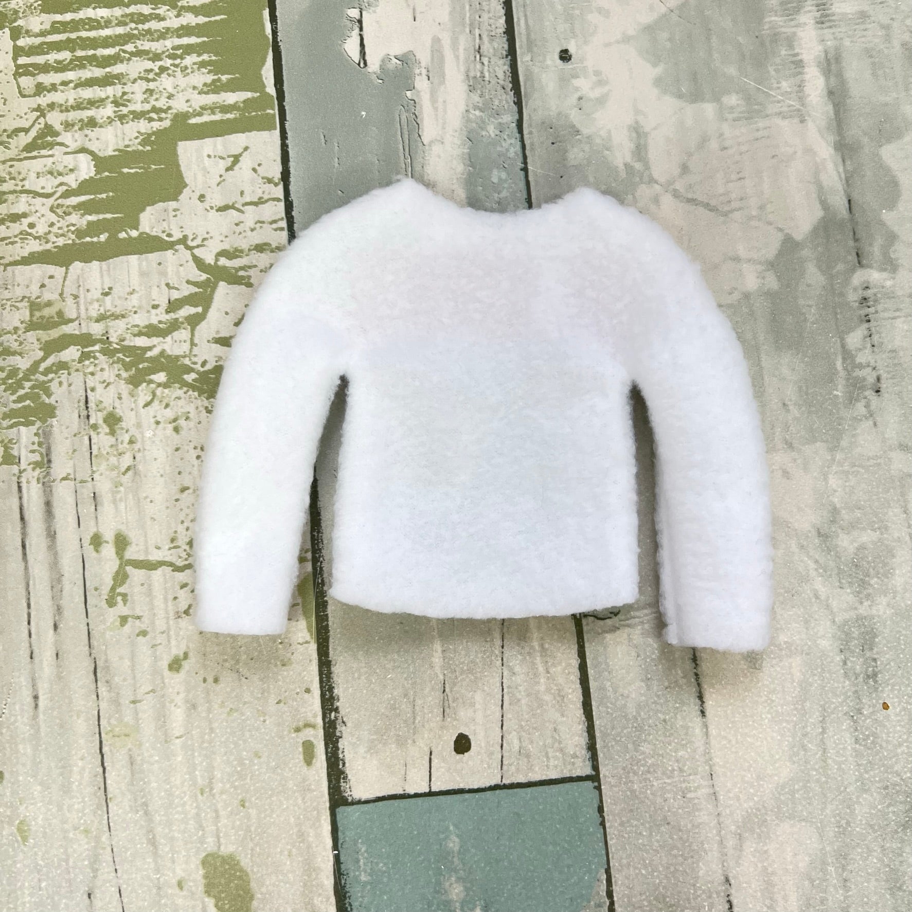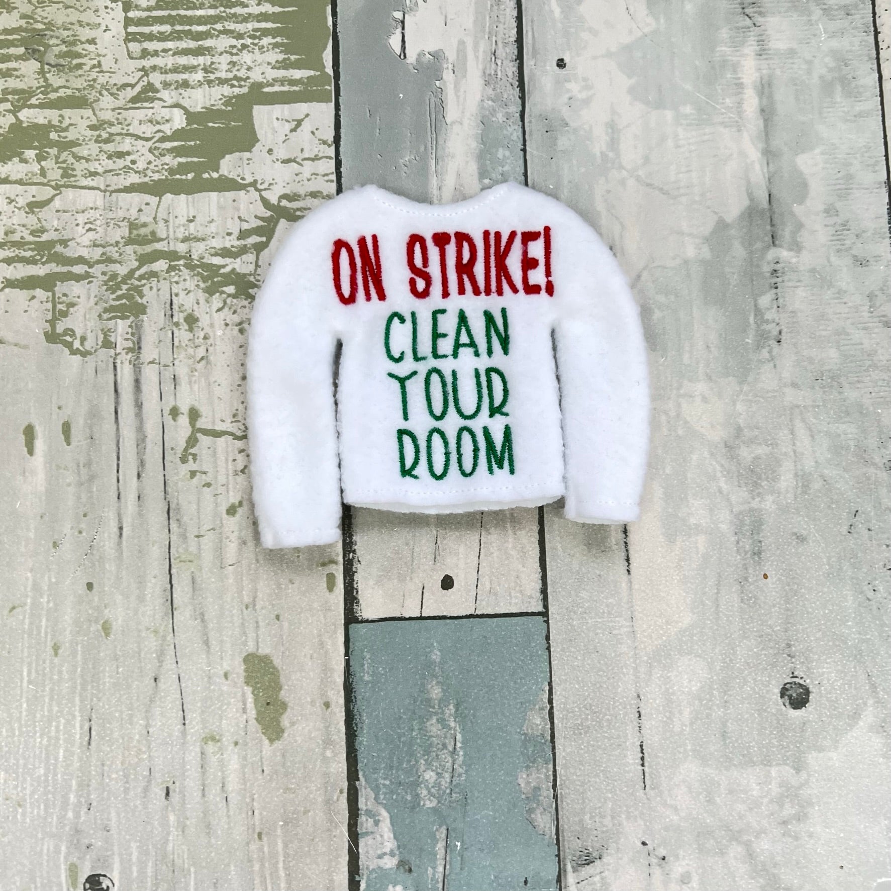 This cheeky white fleece sweater features embroidered text that reads “On Strike! Clean your room,” giving your elf the energy of a tiny protester who has absolutely had it with the mess. The design feels dramatic and full of personality, like your elf is staging a miniature walkout until someone picks up their socks.
