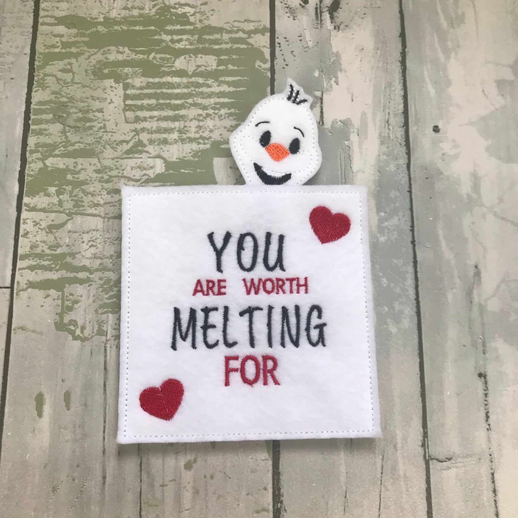 A handmade felt snowman finger puppet holding a heart, paired with a “You are worth melting for” card for warm and wintry gifting.