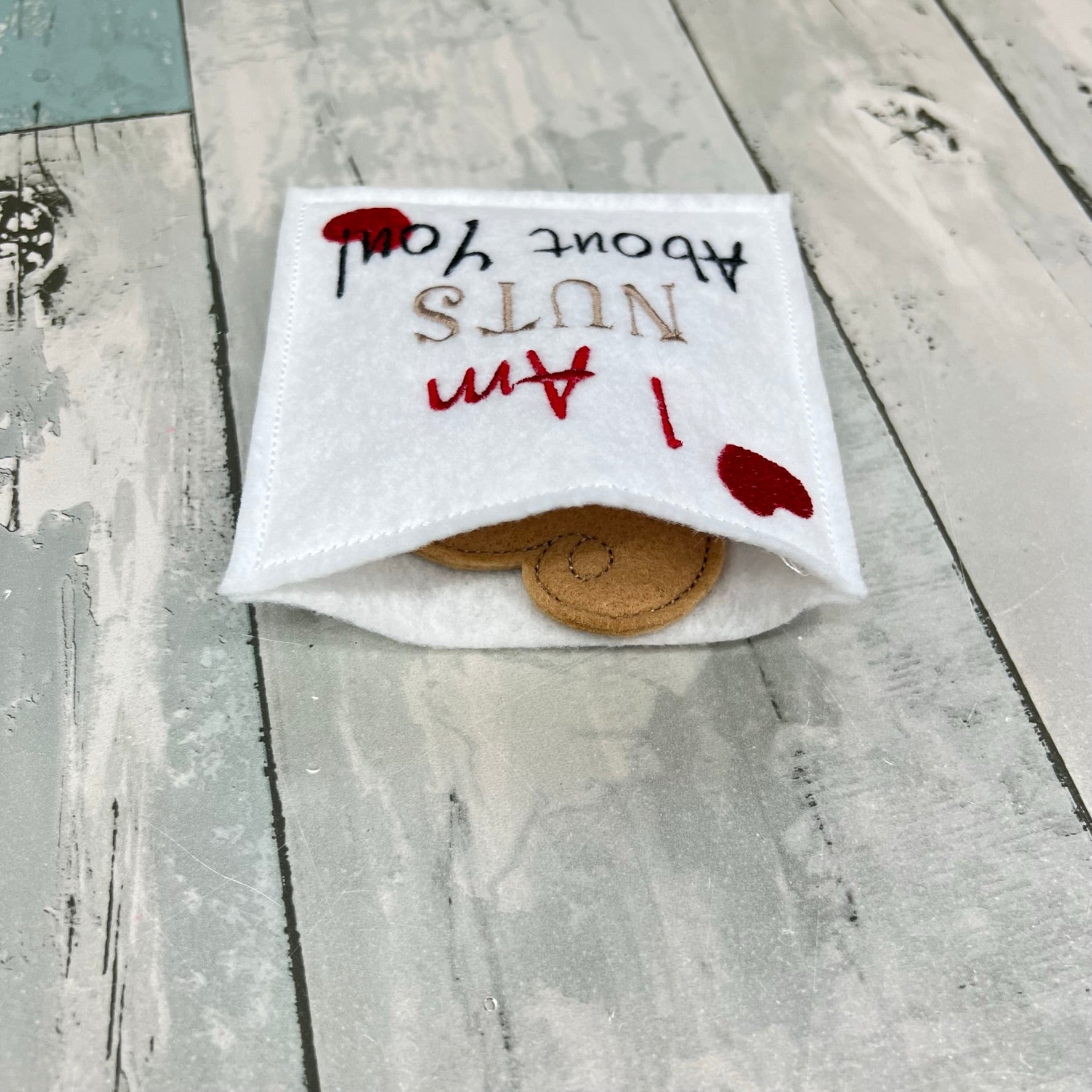 A handmade felt squirrel finger puppet holding a heart‑shaped acorn, paired with an “I am nuts about you” card for cute and playful gifting.