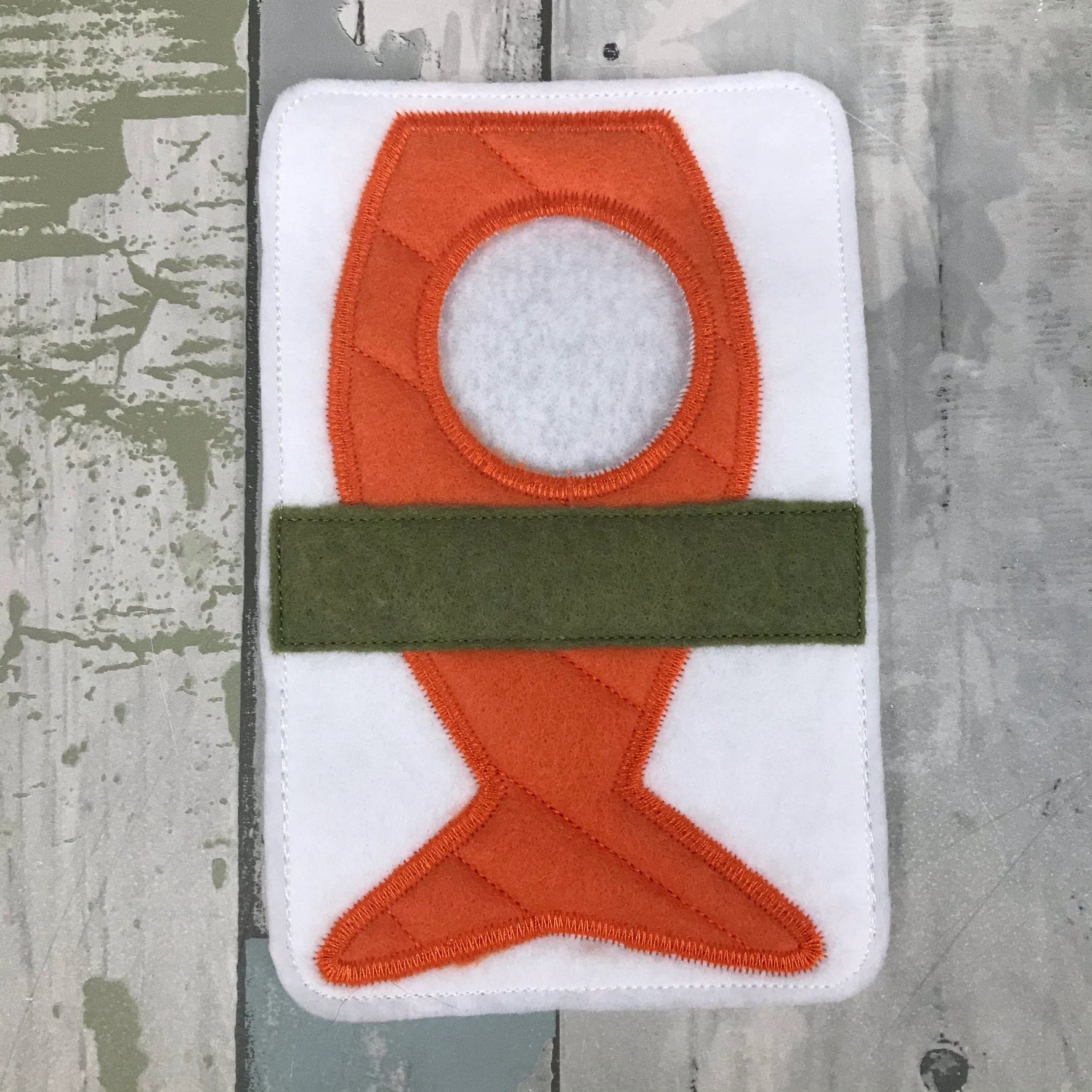 A soft felt nigiri sushi costume sized for a small holiday elf friend. Gentle shapes and colorful toppings make it perfect for playful kitchen scenes and imaginative seasonal fun.