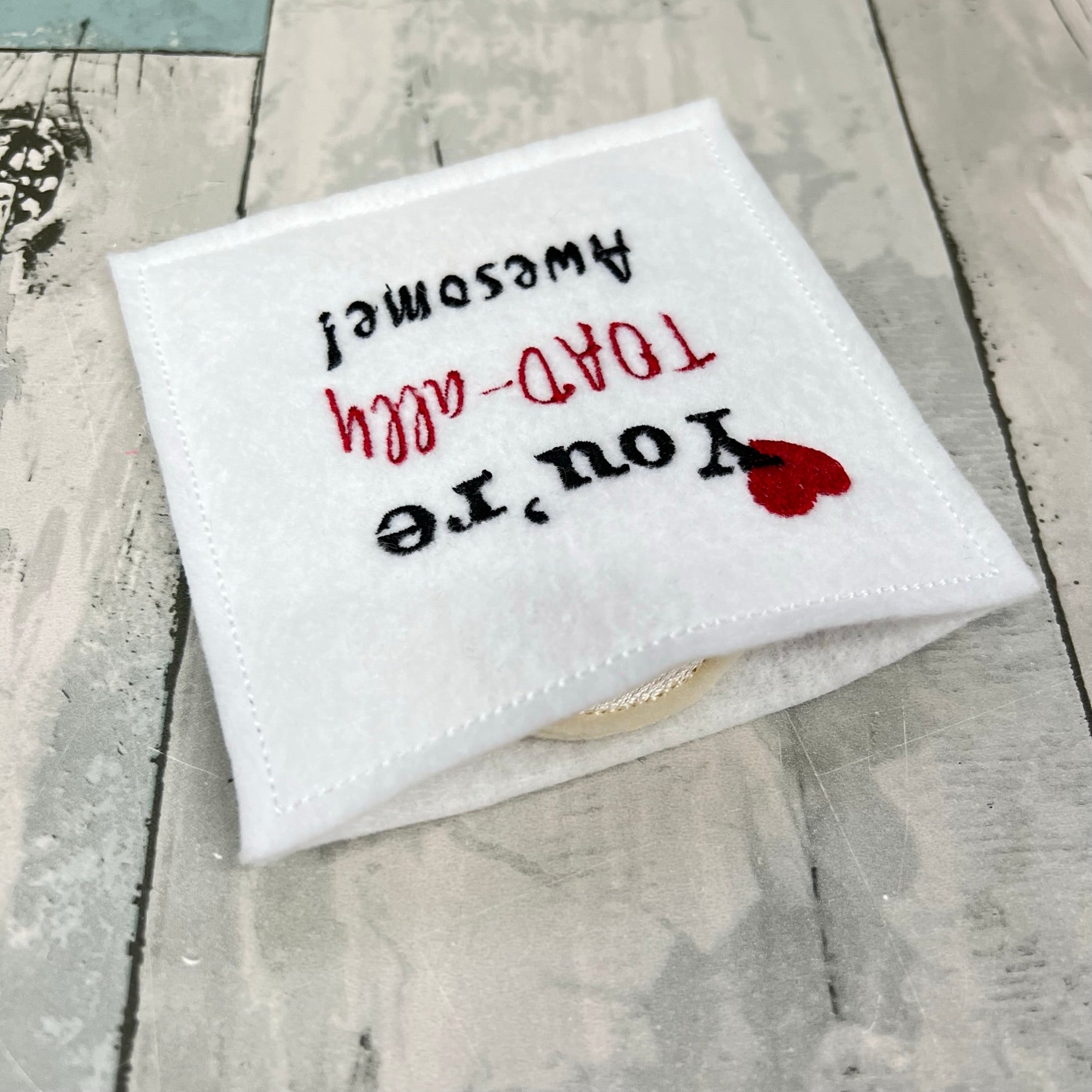 A handmade felt mushroom‑capped finger puppet paired with a “You’re toad‑ally awesome!” card for fun and cheerful gifting.