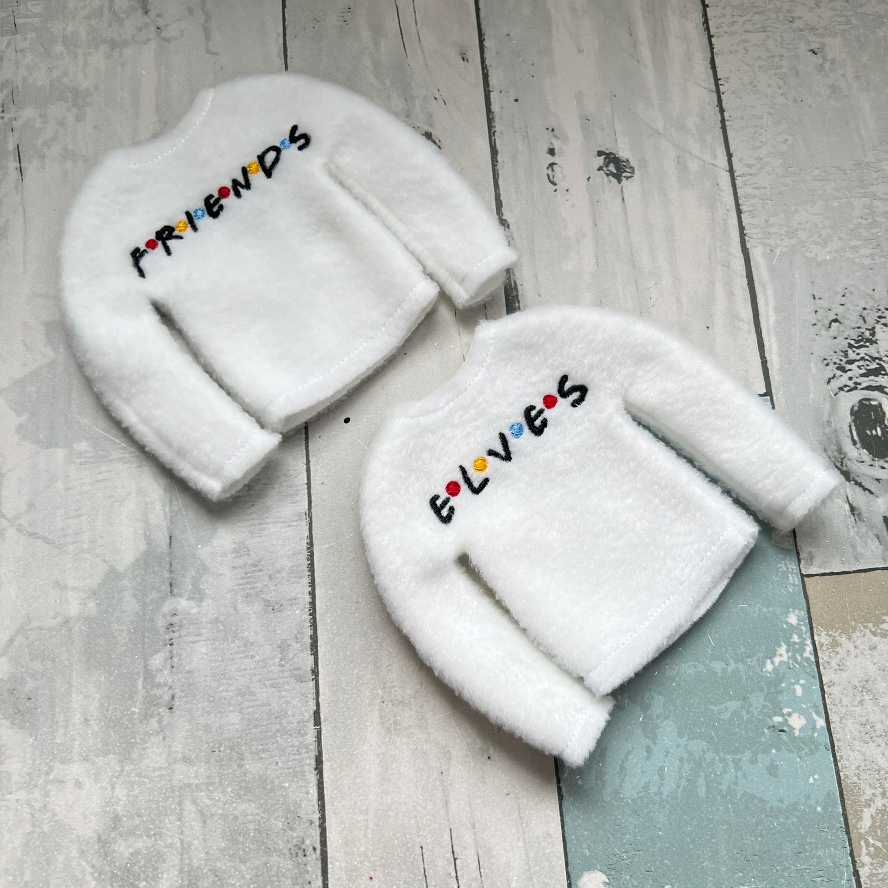 This cozy white fleece sweater features embroidered lettering in the iconic spaced‑out style made famous by a certain sitcom, complete with colorful dots between each letter. You can choose the classic version or a playful “Elves” variation that gives your elf its own starring role in the theme song.