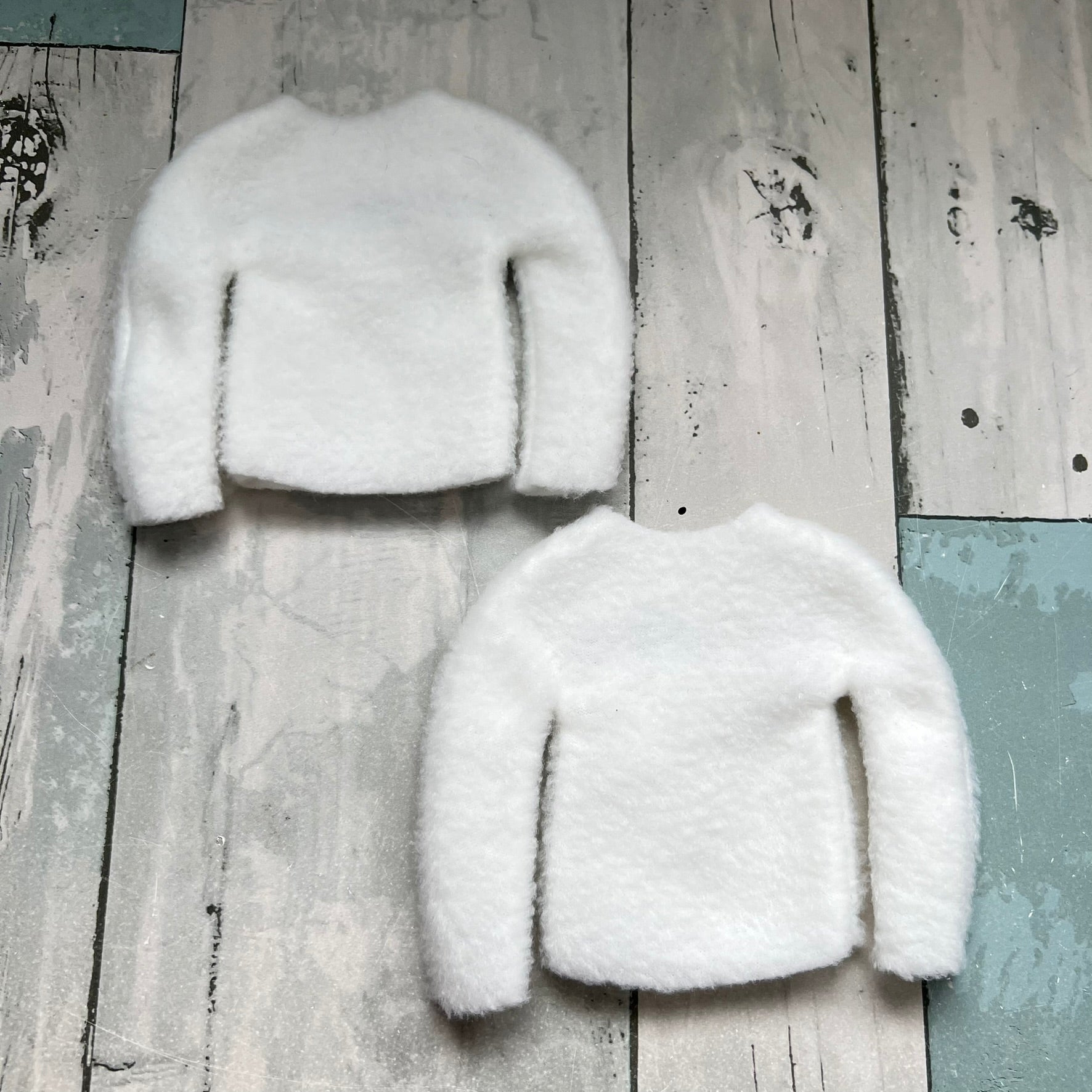 A white fleece sweater embroidered with a sitcom‑style logo in classic or “Elves” lettering. Perfect for cozy scenes and playful elf storytelling.